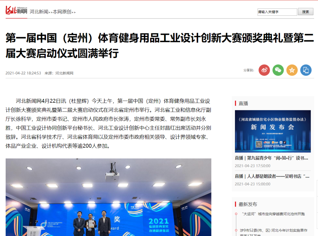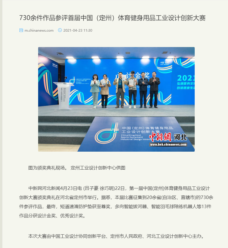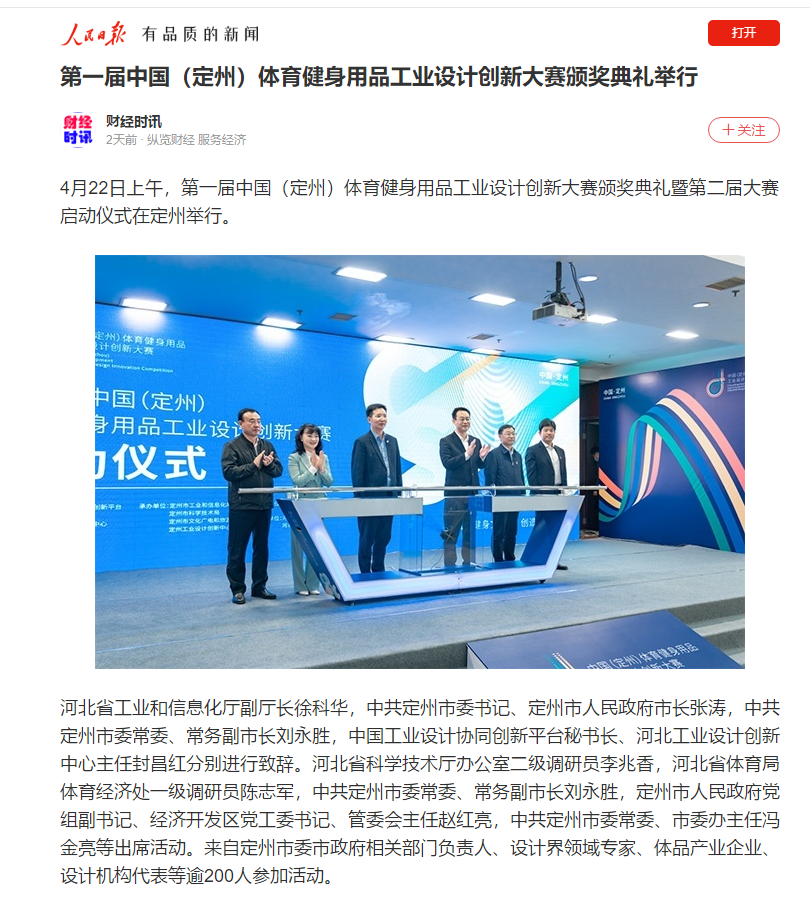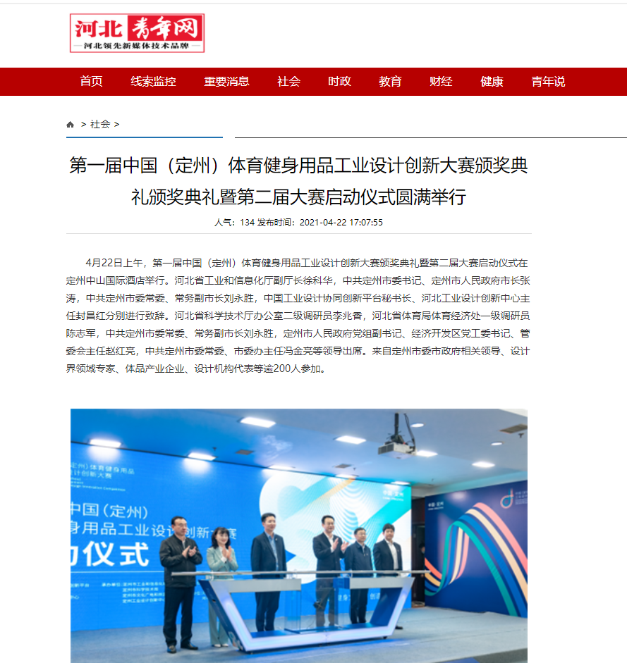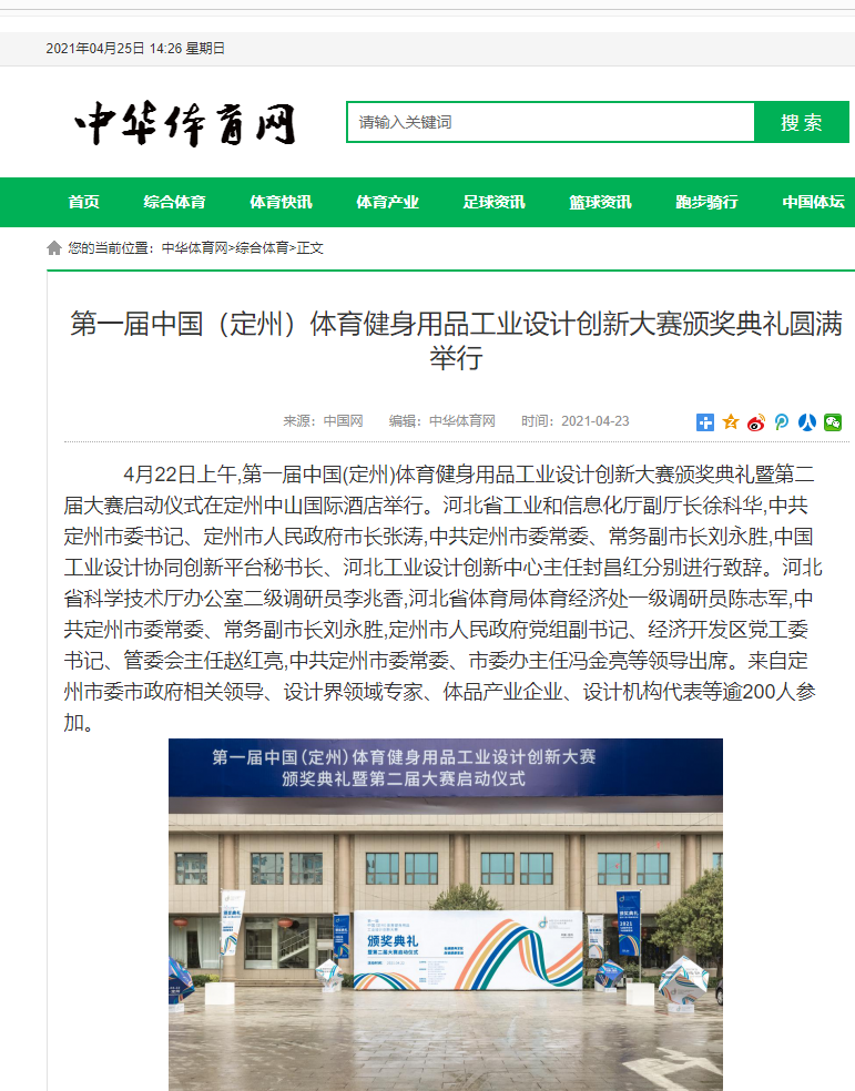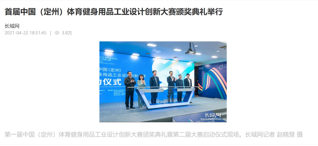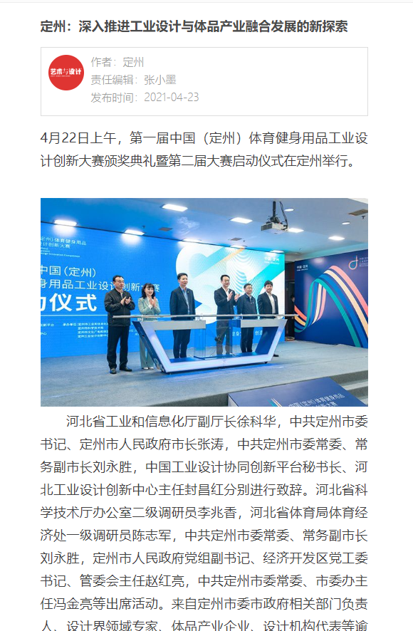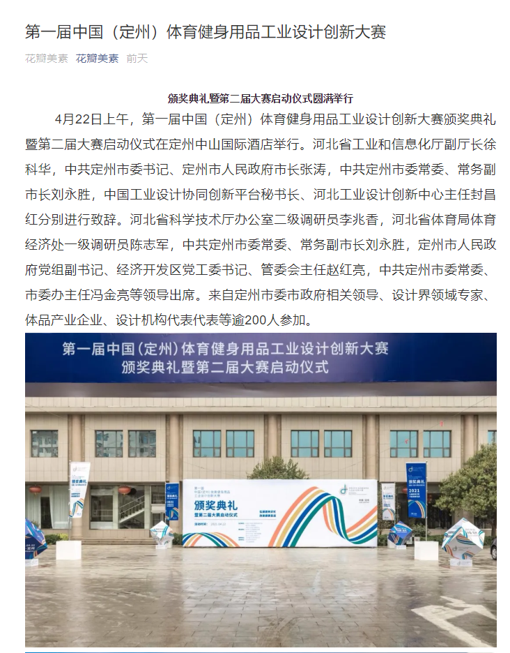 2021年4月22日,由定州市人民政府主办,定州市工业和信息化局、定州科学技术局、定州市文化广电和旅游局、定州工业设计创新中心承办的第一届中国(定州)体育健身用品工业设计创新大赛颁奖典礼暨第二届大赛启动仪式圆满举行。