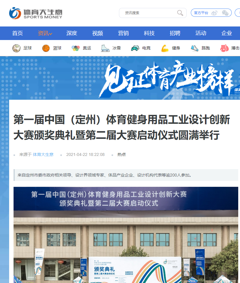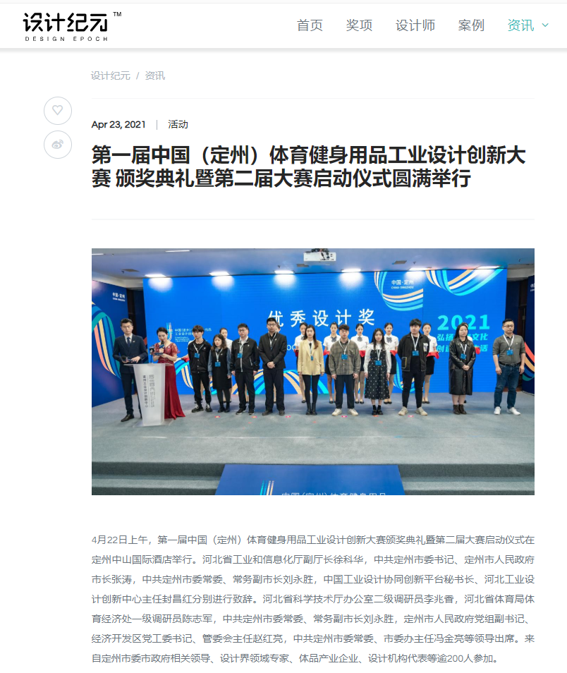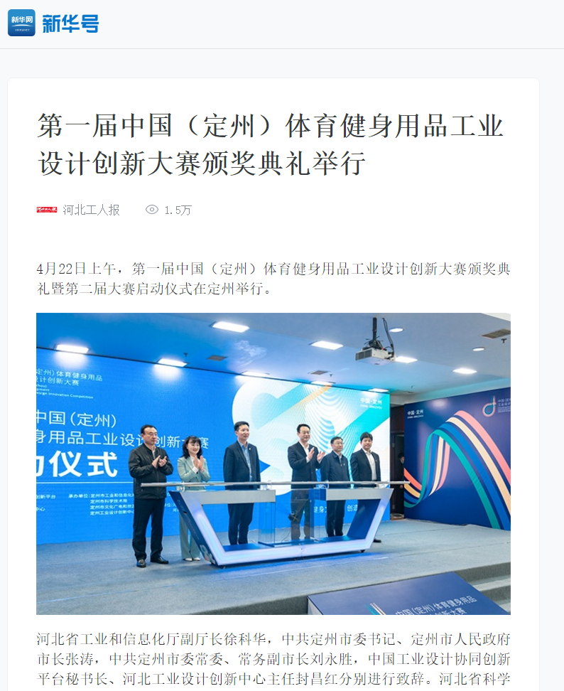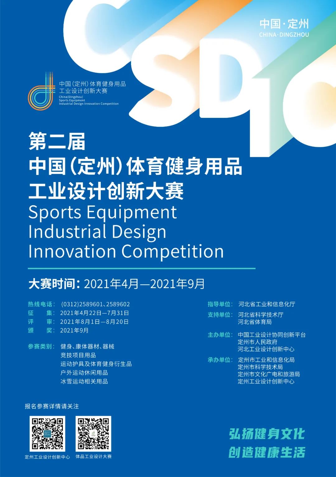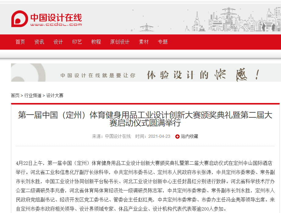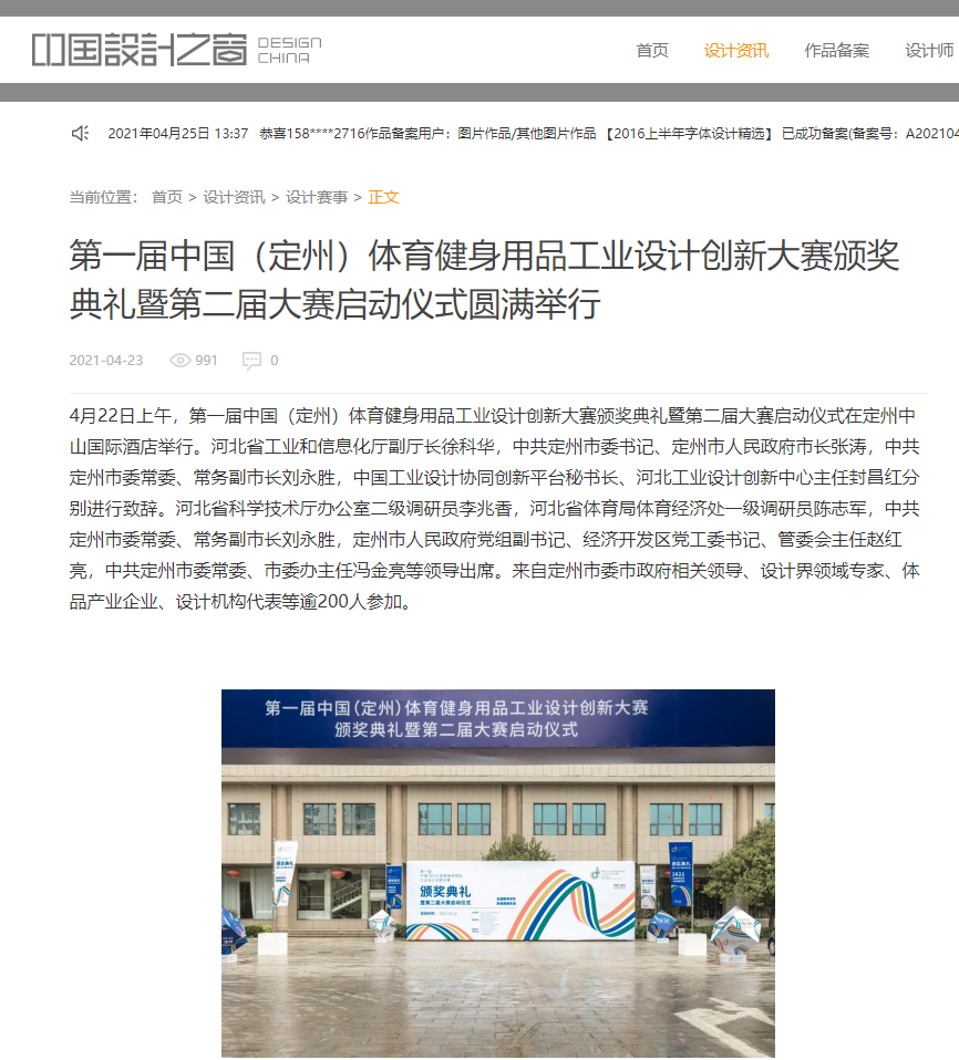 2021年4月22日,由定州市人民政府主办,定州市工业和信息化局、定州科学技术局、定州市文化广电和旅游局、定州工业设计创新中心承办的第一届中国(定州)体育健身用品工业设计创新大赛颁奖典礼暨第二届大赛启动仪式圆满举行。