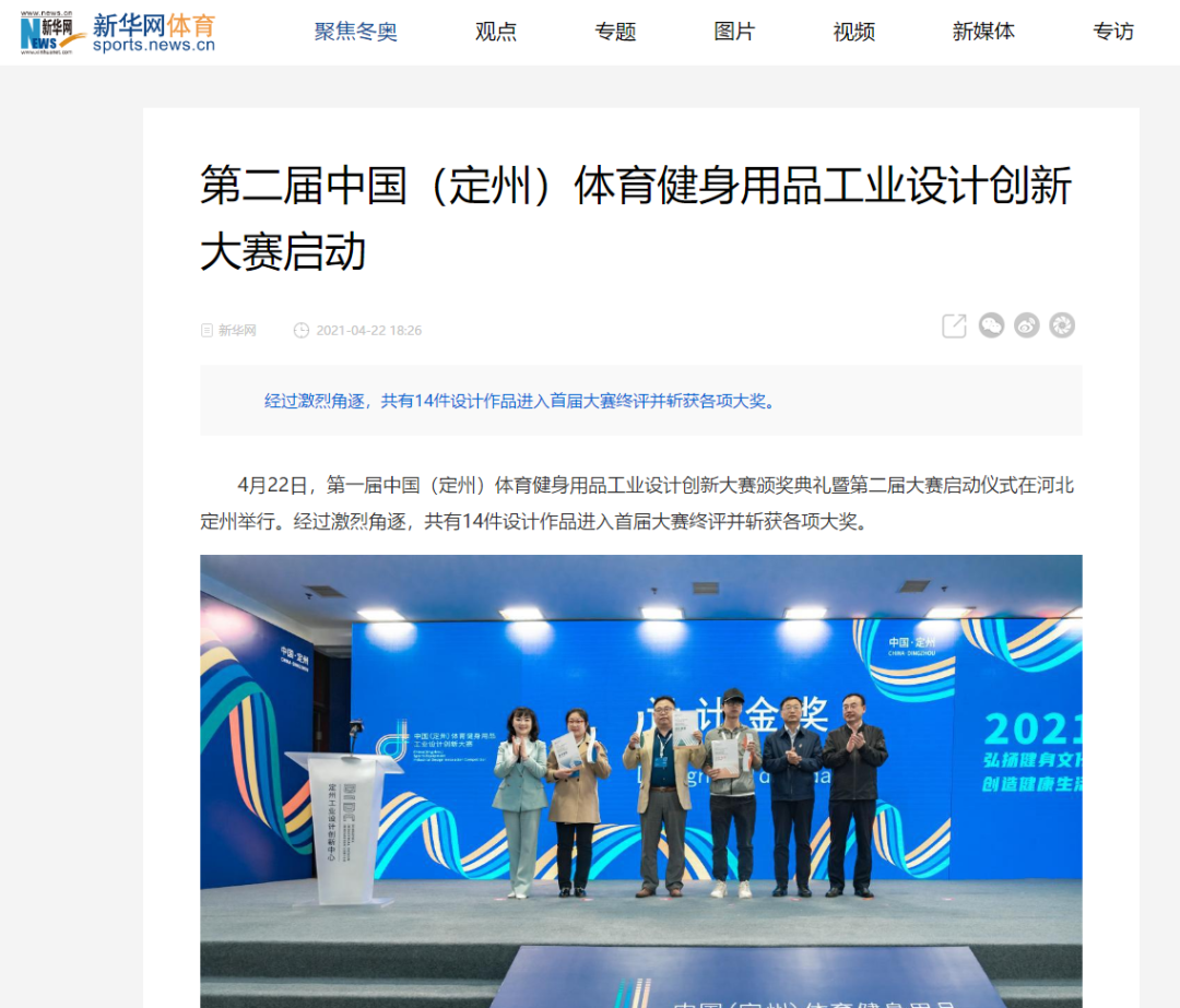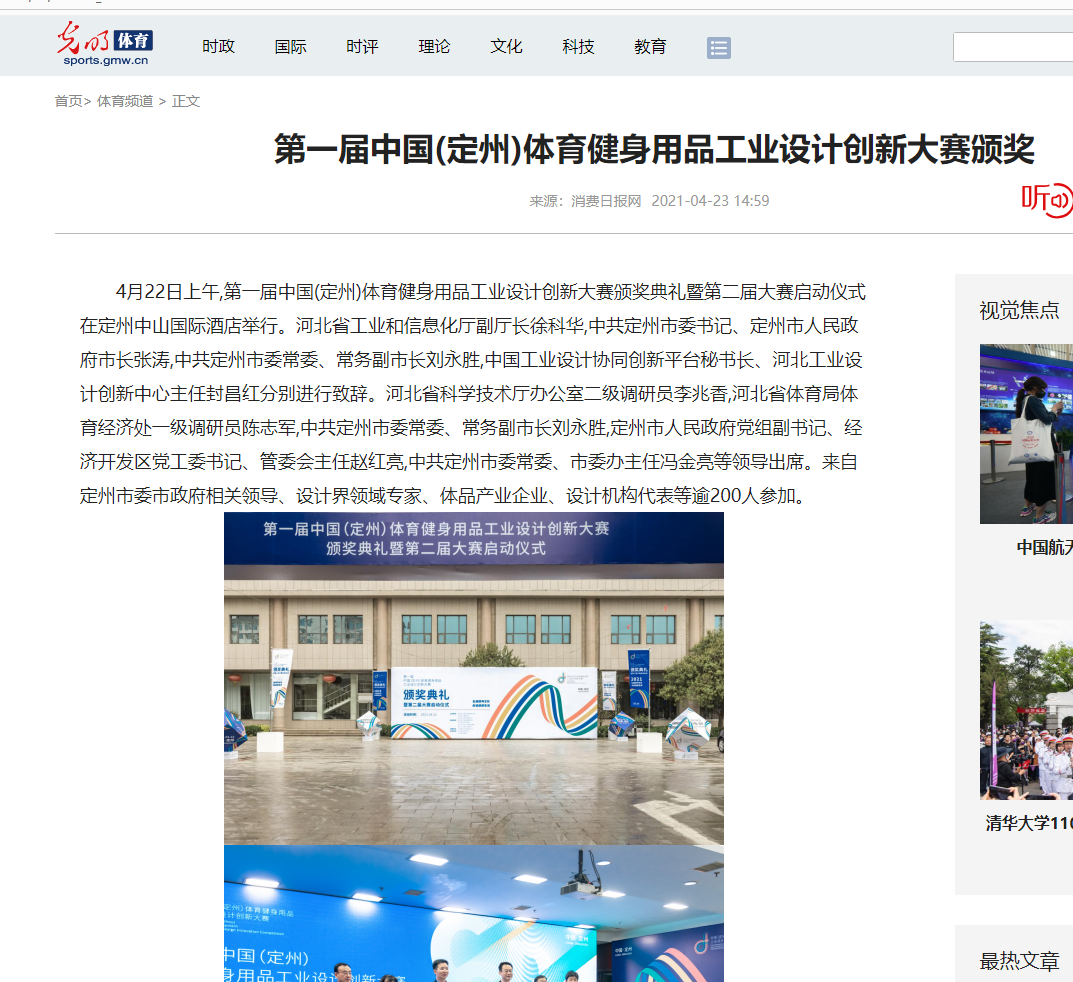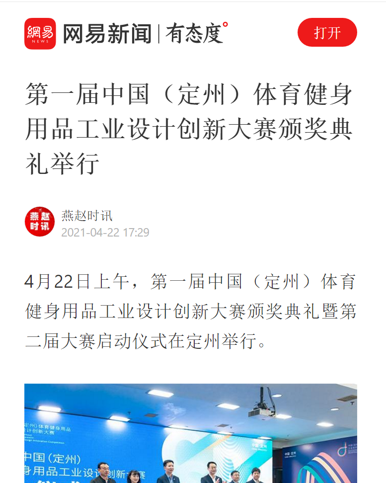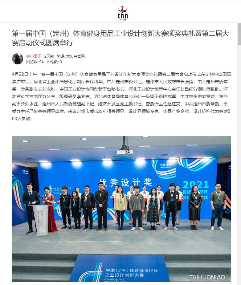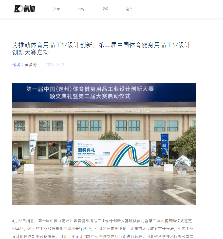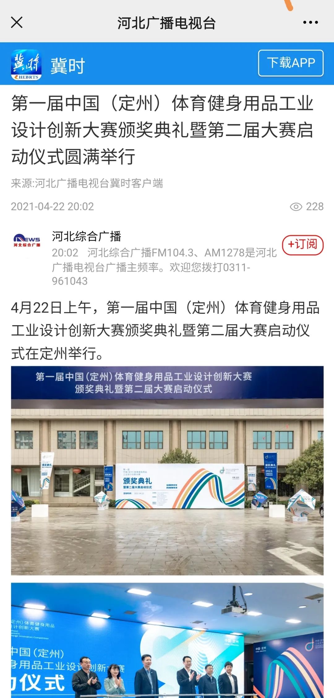 2021年4月22日,由定州市人民政府主办,定州市工业和信息化局、定州科学技术局、定州市文化广电和旅游局、定州工业设计创新中心承办的第一届中国(定州)体育健身用品工业设计创新大赛颁奖典礼暨第二届大赛启动仪式圆满举行。