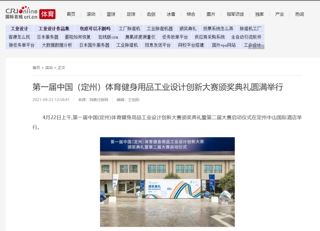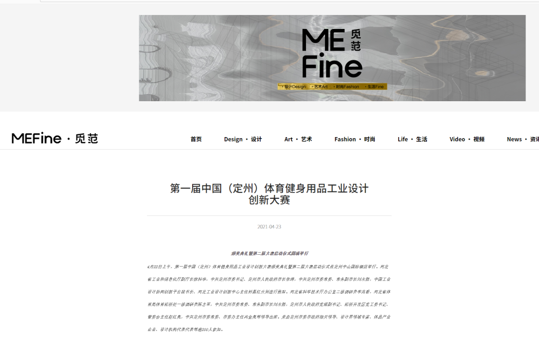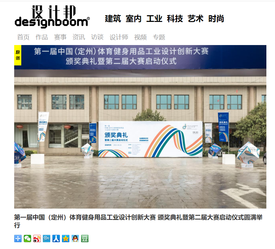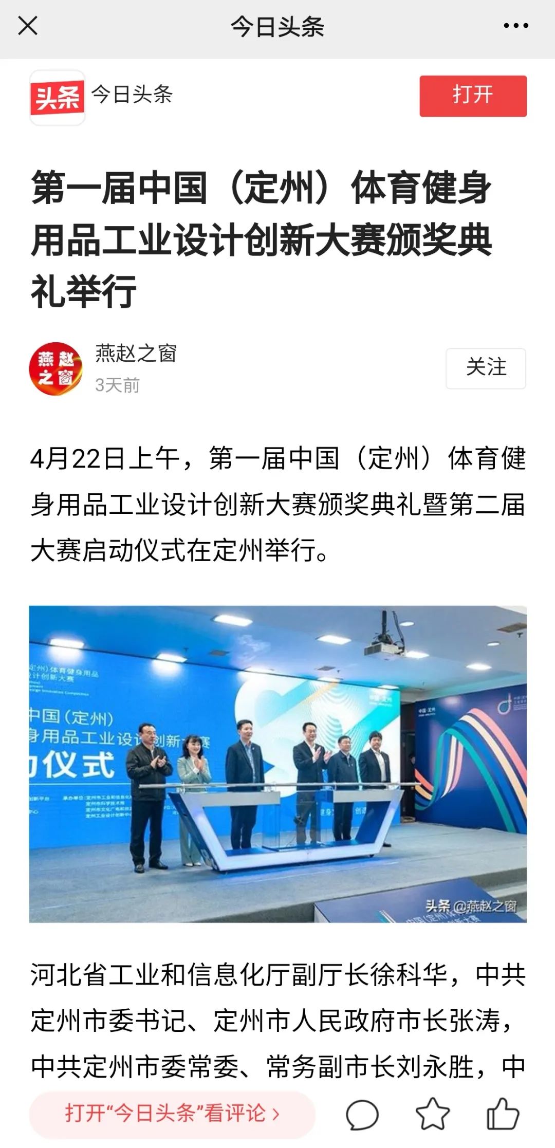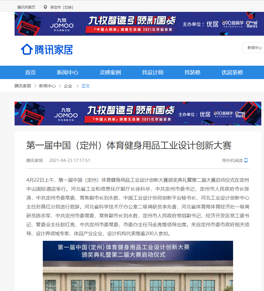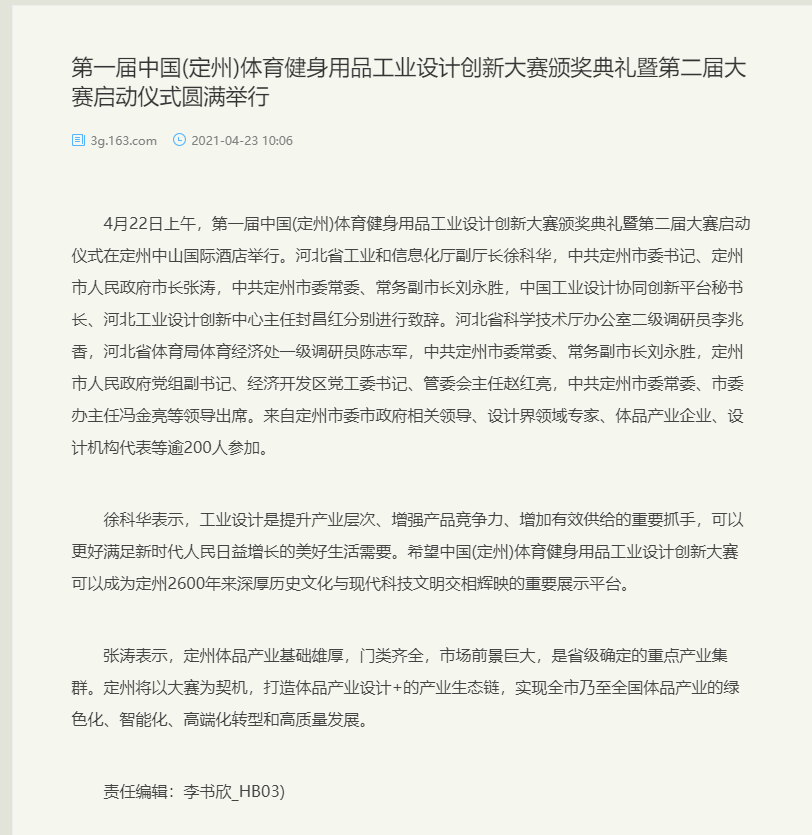 2021年4月22日,由定州市人民政府主办,定州市工业和信息化局、定州科学技术局、定州市文化广电和旅游局、定州工业设计创新中心承办的第一届中国(定州)体育健身用品工业设计创新大赛颁奖典礼暨第二届大赛启动仪式圆满举行。