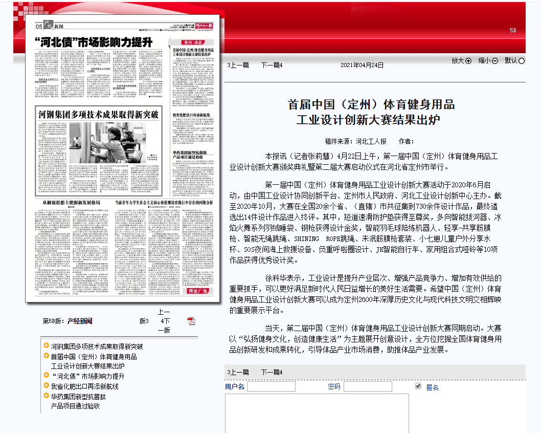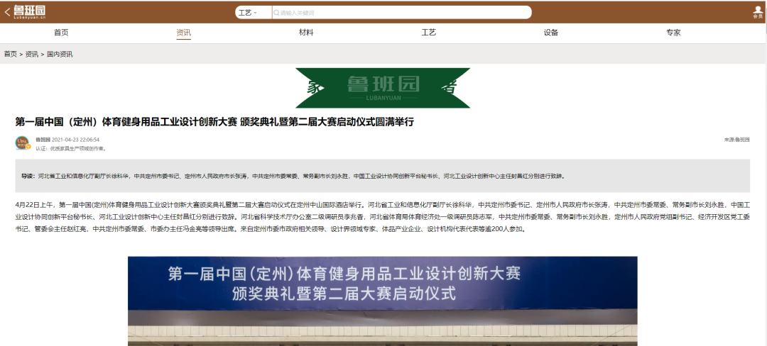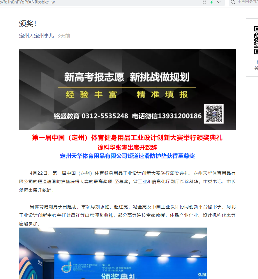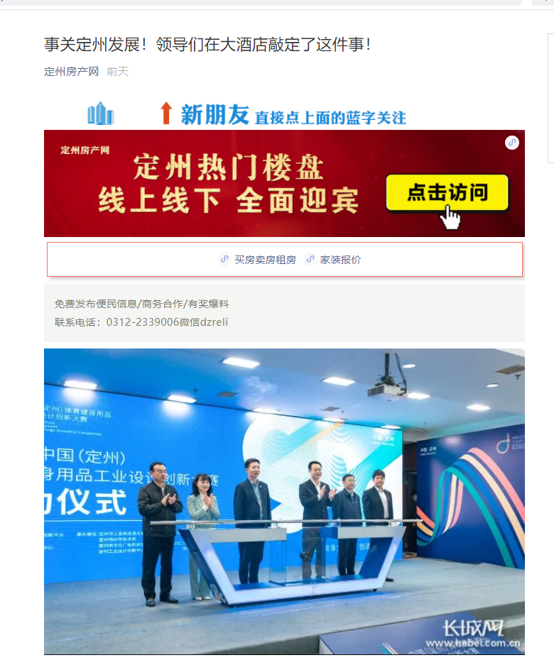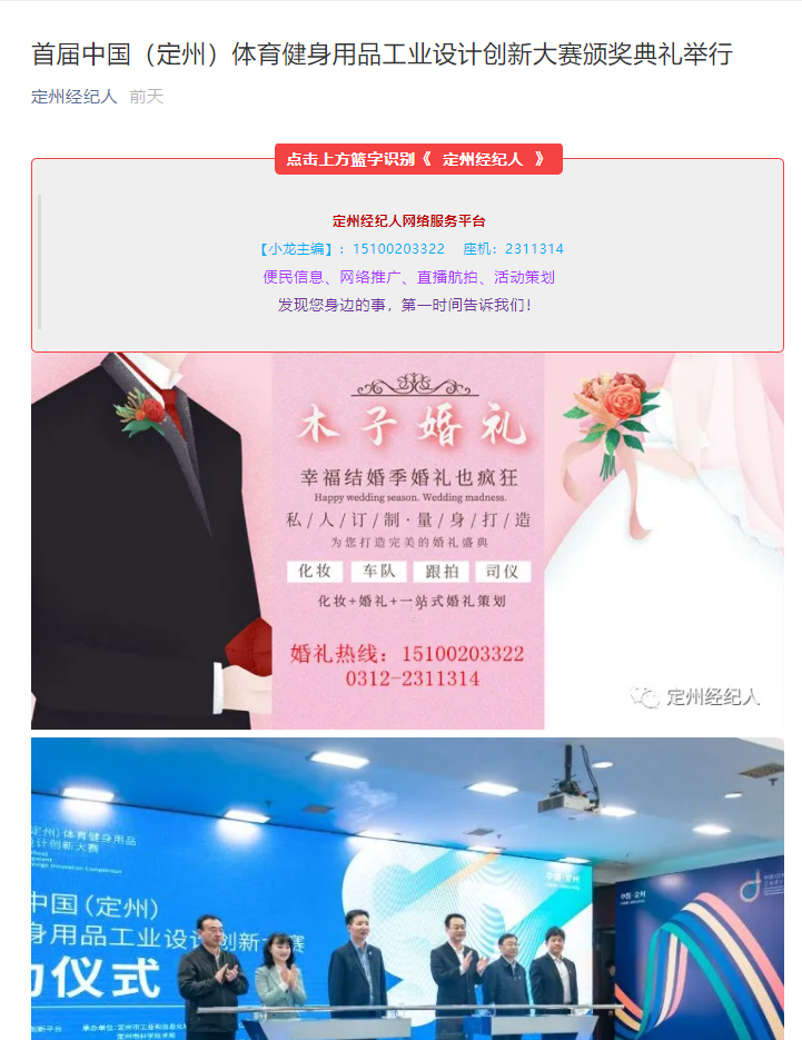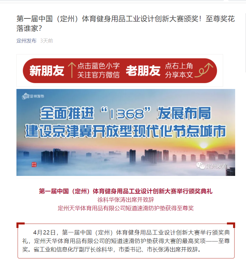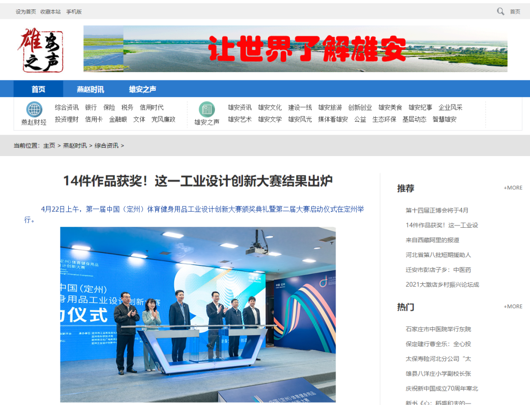 2021年4月22日,由定州市人民政府主办,定州市工业和信息化局、定州科学技术局、定州市文化广电和旅游局、定州工业设计创新中心承办的第一届中国(定州)体育健身用品工业设计创新大赛颁奖典礼暨第二届大赛启动仪式圆满举行。