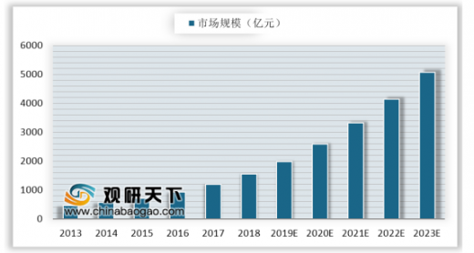 2013年我国工业设计行业市场规模已达470亿元,并呈现逐年高速增长态势,截止至2017年我国工业设计行业市场规模增长至接近1200亿元,达到月1199亿元。初步测算2018年我国工业设计行业市场规模将达1556亿元左右。预测2019年我国工业设计行业市场规模将接近2000亿元。并预测在2023年我国工业设计行业市场规模将突破5000亿元,达到了5083亿元左右,2019-2023年均复合增长率约为26.44%。